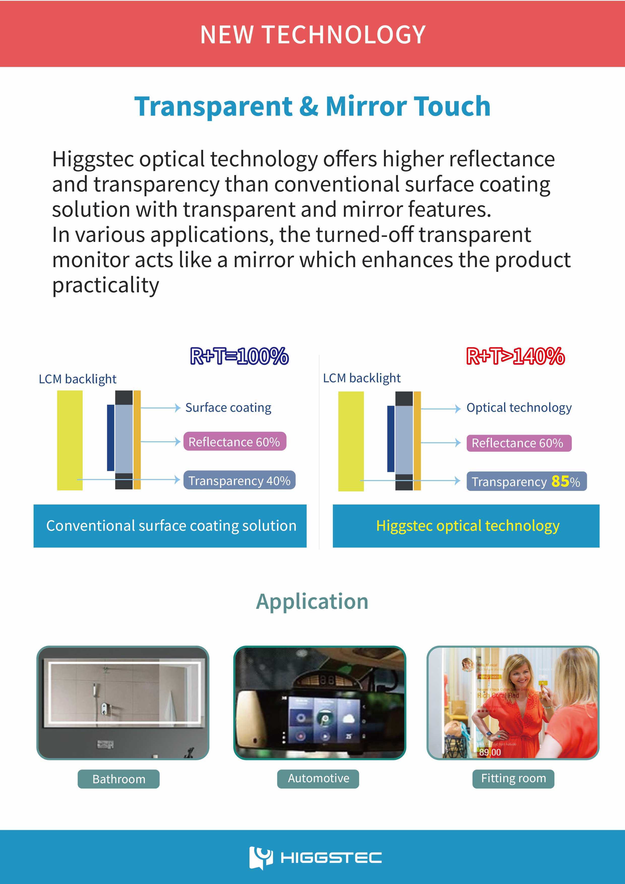 This transparent and mirror touch technology offers superior reflectance and transparency, allowing the display to function as a mirror when off, enhancing product versatility.