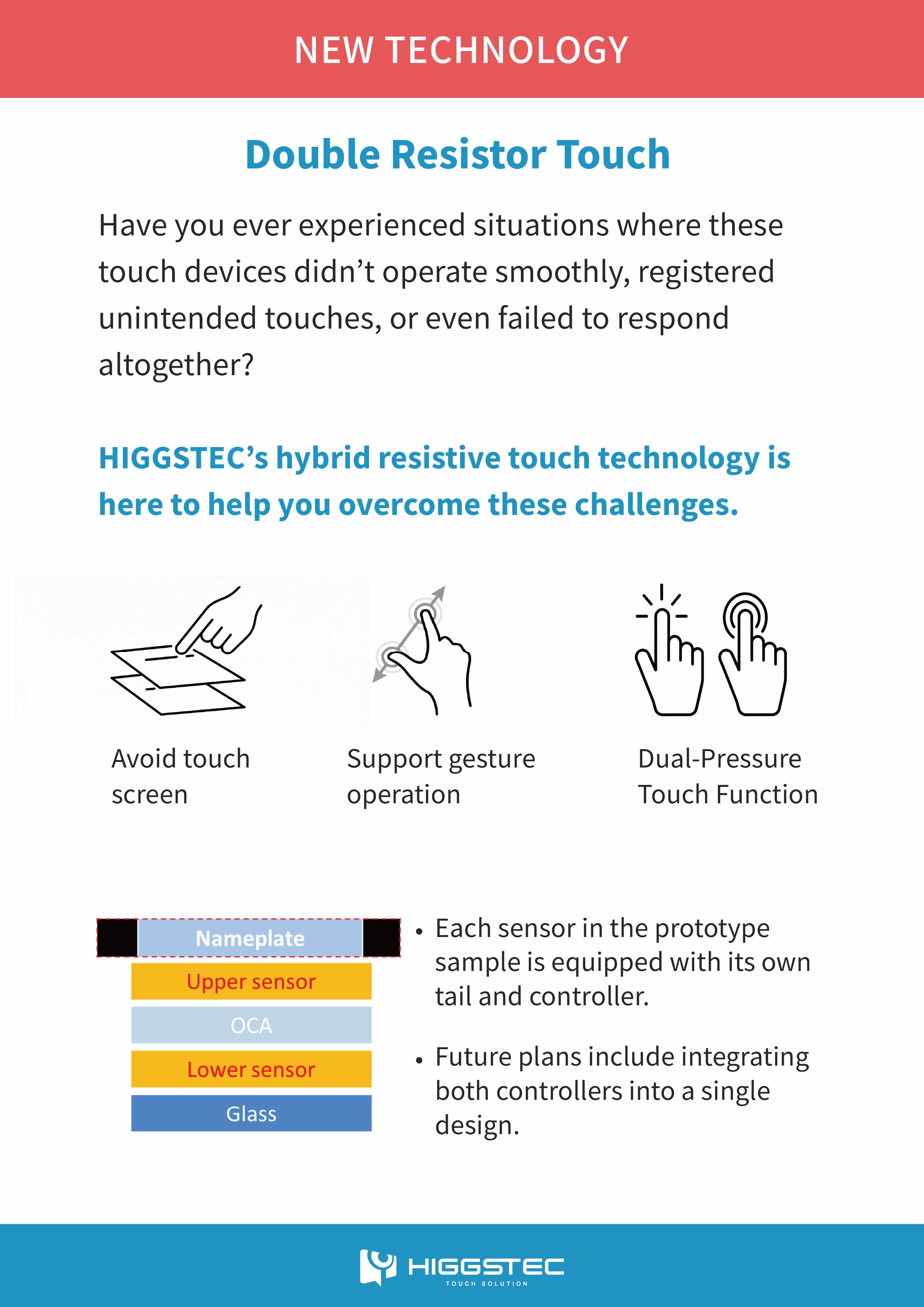 This double resistor touch technology resolves common resistive touch issues, supporting gesture operations and dual-pressure sensing for enhanced reliability.