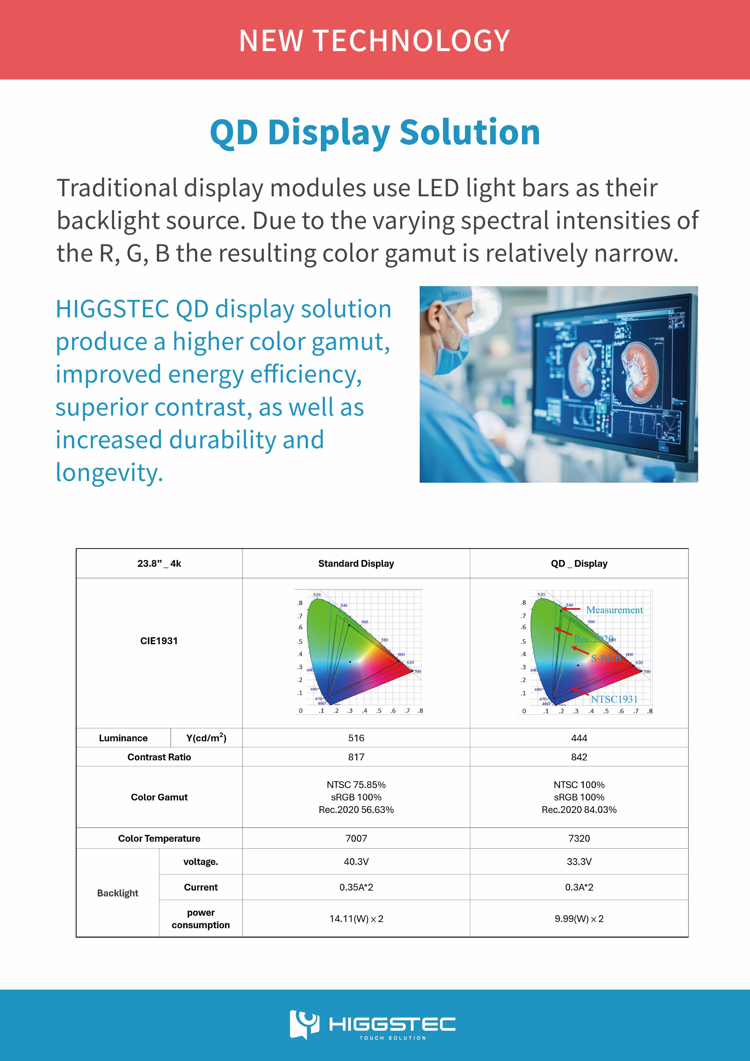 This QD display solution delivers a wider color gamut, improved energy efficiency, superior contrast, and extended durability compared to traditional LED displays.